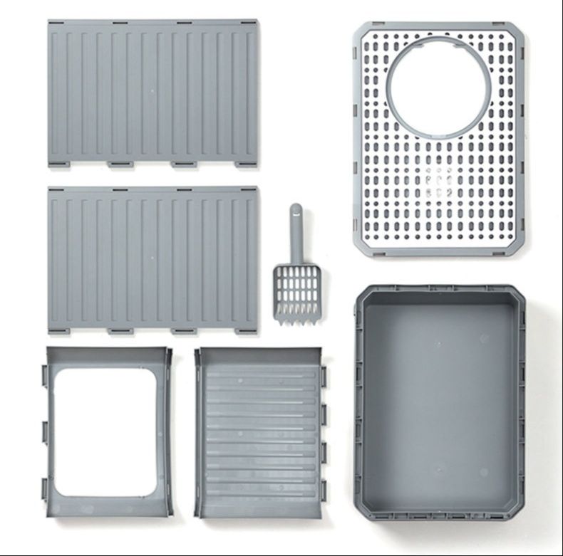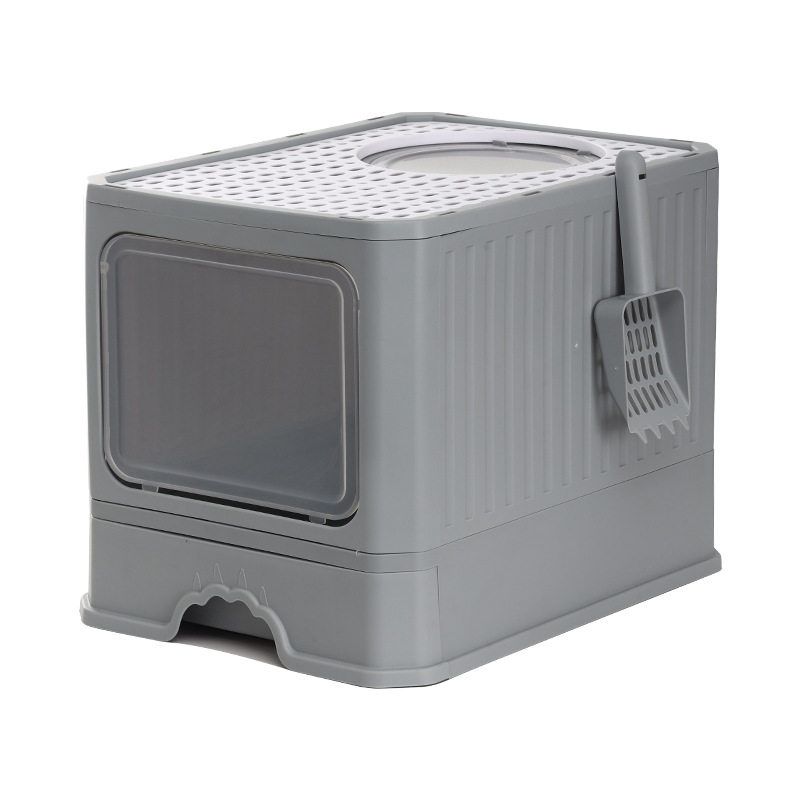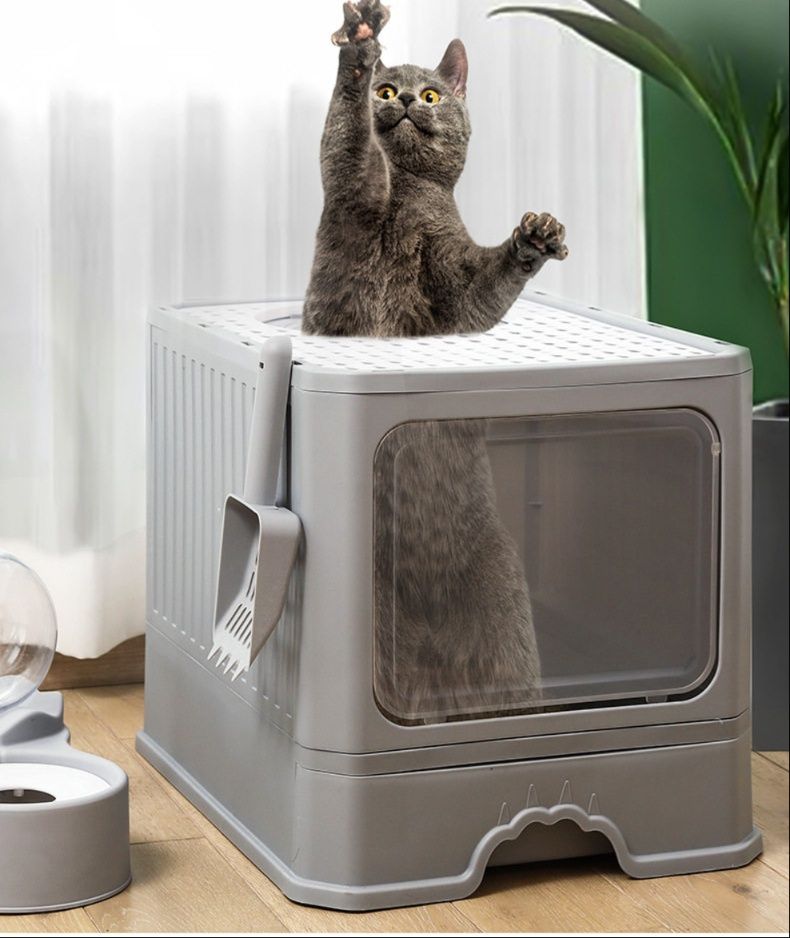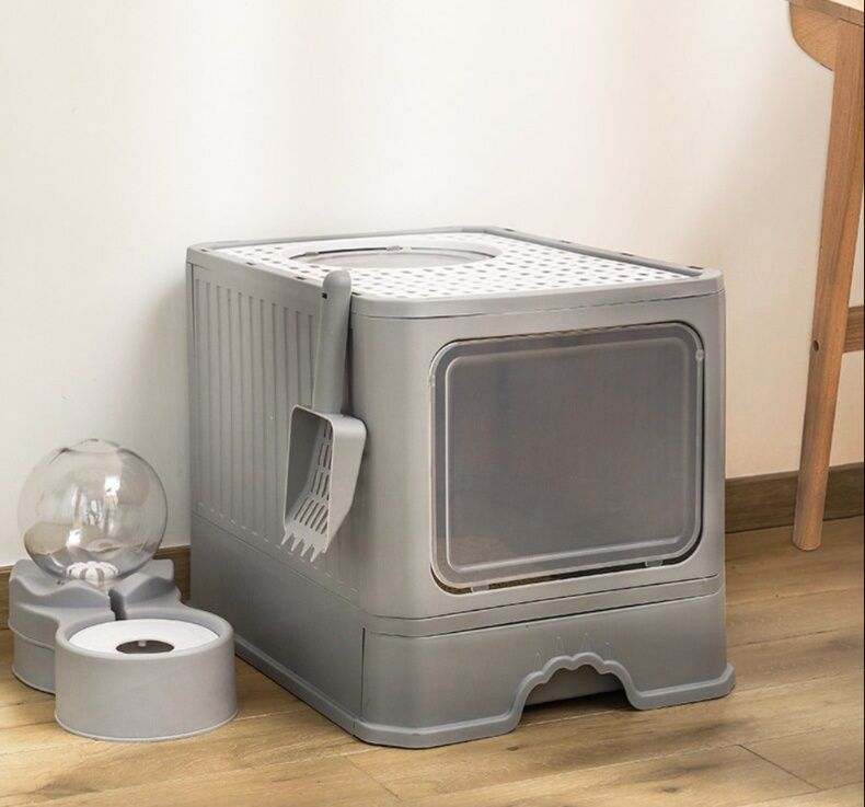 上部から出入りできる構造のドーム型猫トイレです。 引き出し式の砂受けトレーで掃除が簡単にでき、飛び散り防止機能も備えています。 通気性に優れた天面デザインで臭いがこもりにくく、大型の猫ちゃんもゆったり使える広々空間を実現しました。 猫砂の飛び散りを最小限に抑える設計で、お部屋を清潔に保ちます。 専用スコップも付属し、日々のお手入れをサポートする機能的な猫トイレです。