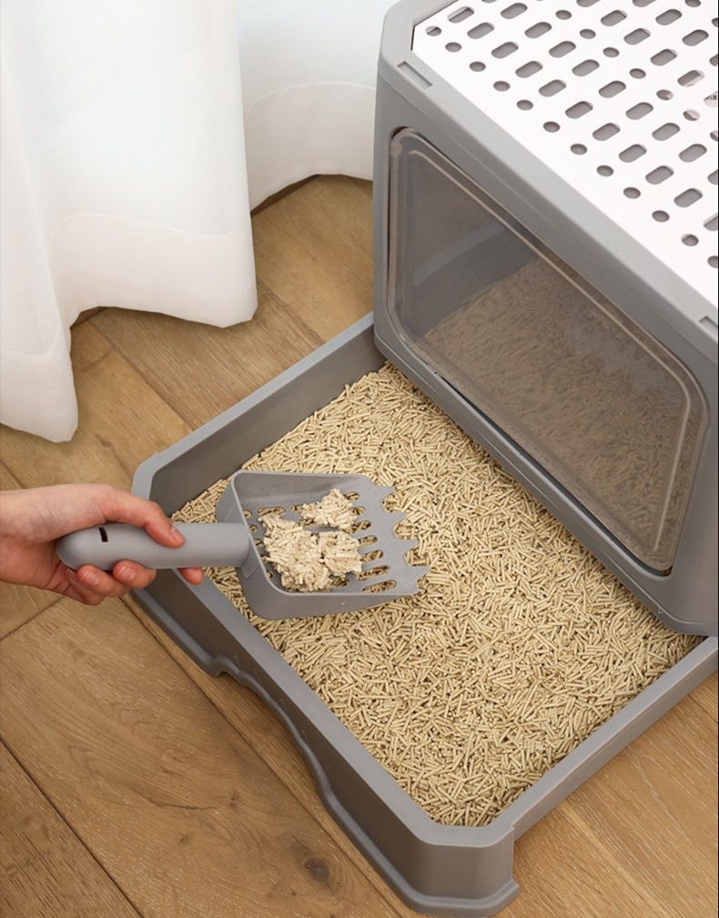 専用スコップも付属し、日々のお手入れをサポートする機能的な猫トイレです。