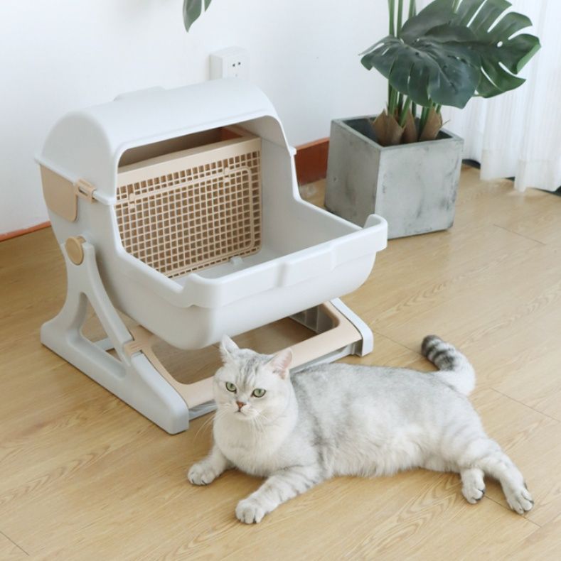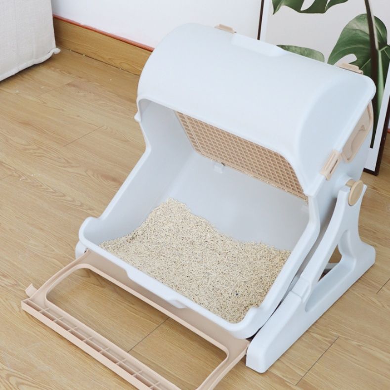 前面に大きな砂受けトレイを配置し、猫砂の飛び散りを最小限に抑えます。