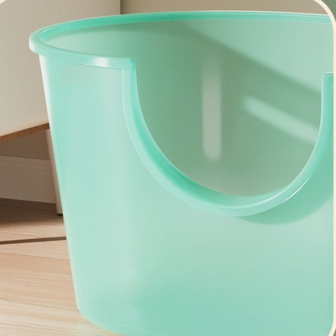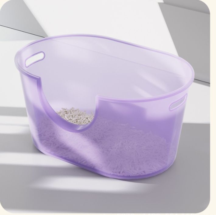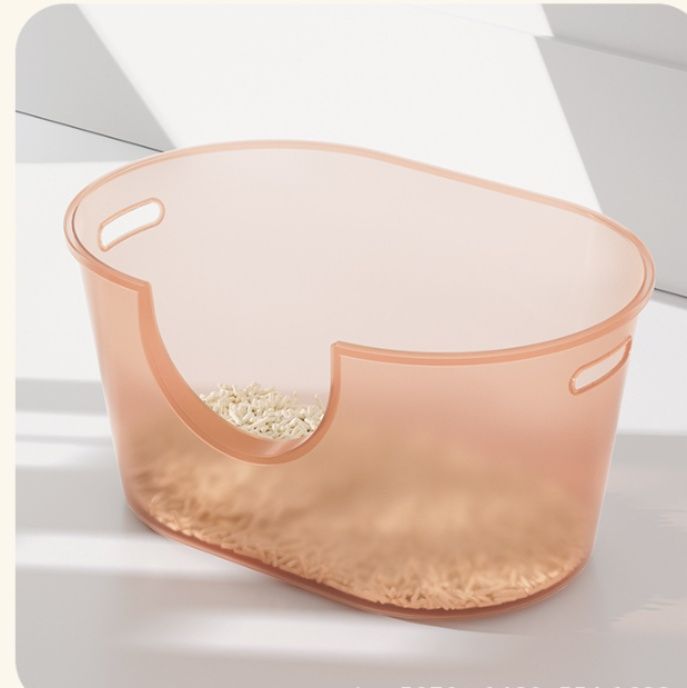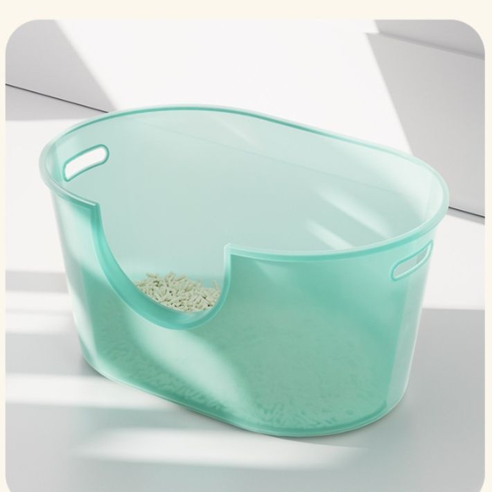上部が大きく開いた設計で猫の出入りがスムーズながら、高めの壁面構造により砂が飛び散らない工夫が施されています。