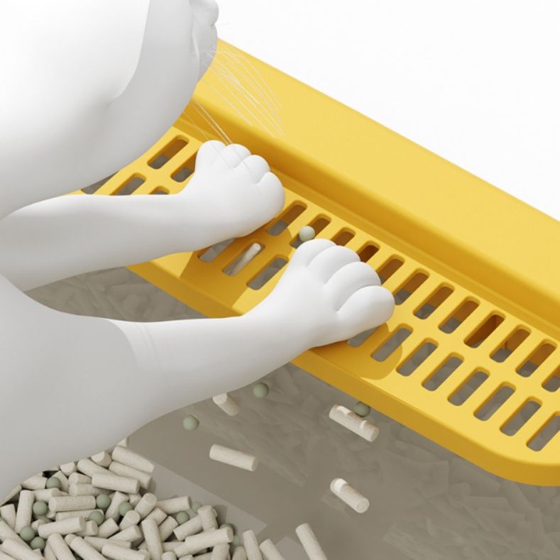 前面扉は開閉式で掃除も簡単、砂の飛び散りを防ぐステップ付きで床を清潔に保ちます。