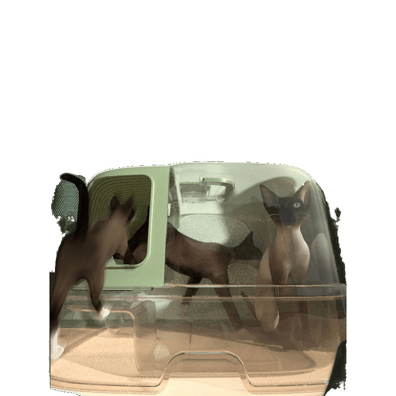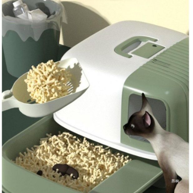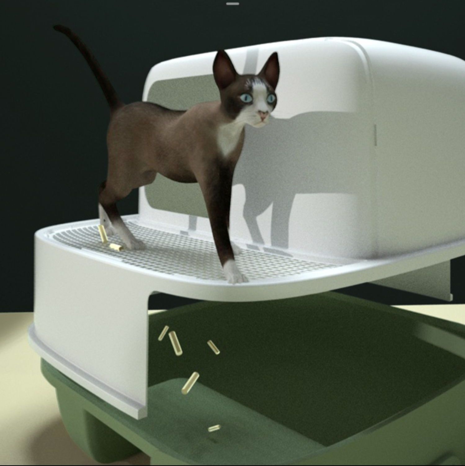引き出し式の二段構造で、上段はプライベート空間を確保したトイレスペース、下段は砂の飛び散りを防ぐ大容量の受け皿になっています。