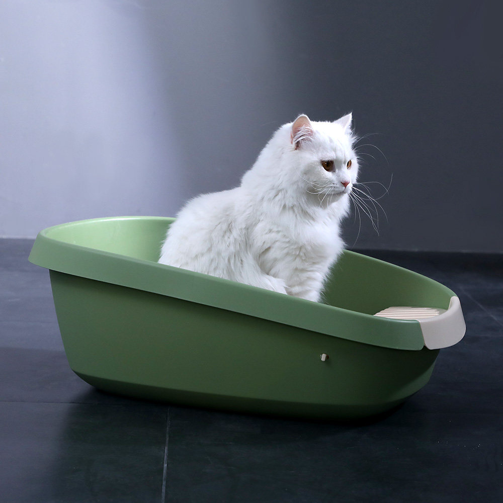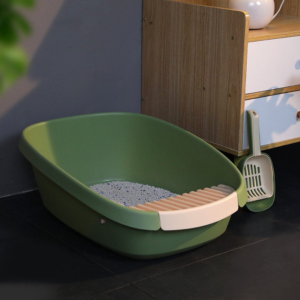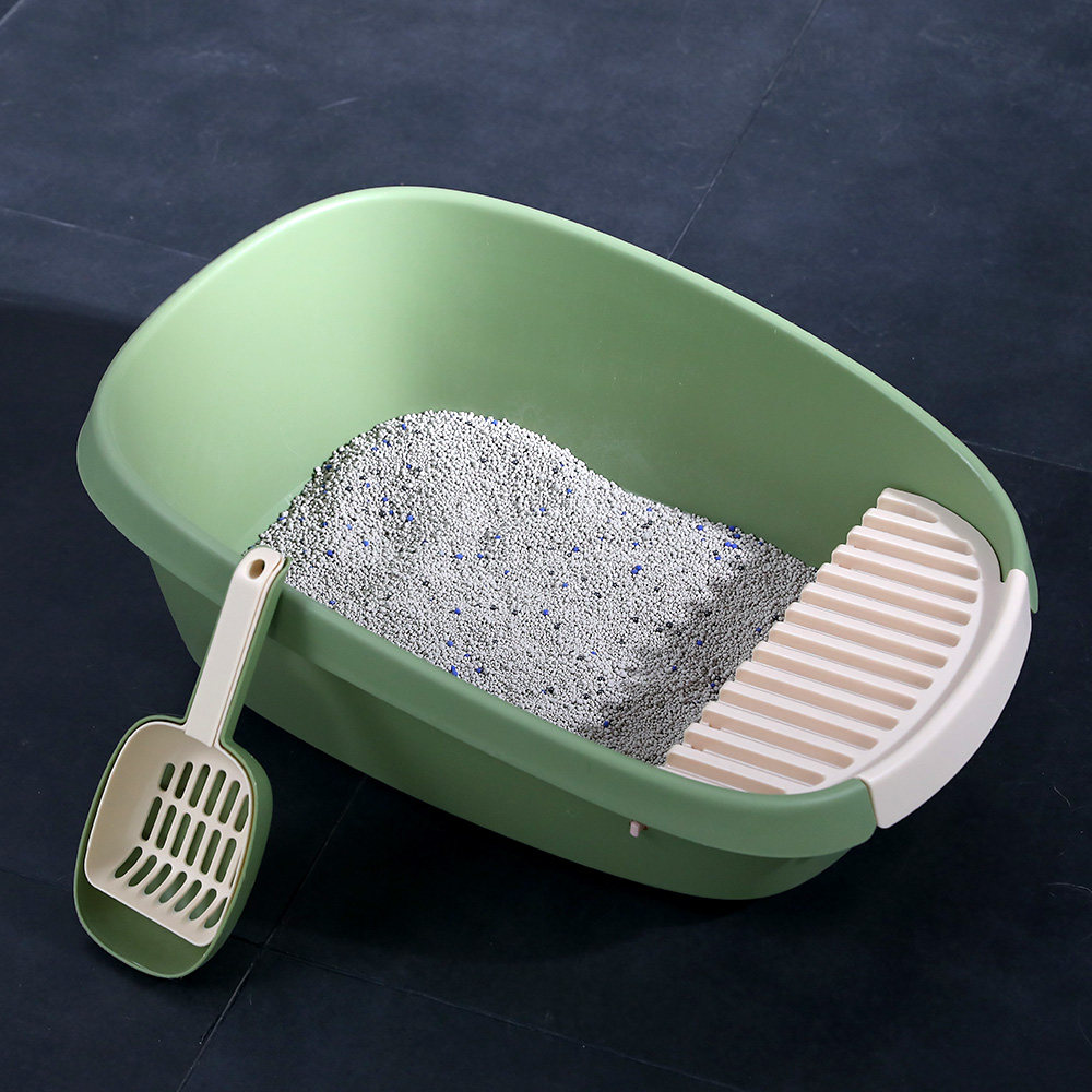 愛猫の快適な空間を追求した小型サイズの猫トイレです。 楕円形のデザインで省スペースながら猫ちゃんが安心して使用できる広さを確保しました。 フチ部分に猫砂取り板が一体化しているため、トイレから出る際に足裏の砂をしっかりキャッチして飛び散りを防止します。 丸みを帯びたフォルムで角がなく、お手入れも簡単です。 付属のスコップでお掃除も楽々、清潔を保てます。