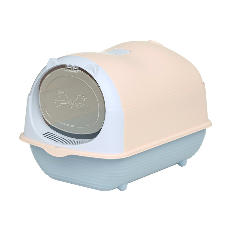 成長期の子猫にぴったりな大きめサイズの猫トイレです。 可愛らしい猫の顔デザインが施されたドーム型フードで、砂の飛び散りをしっかり防ぎます。 上部が180度大きく開く構造で、砂の補充やお手入れが簡単に行えます。 通気口付きで臭いがこもりにくく、入口は子猫でも出入りしやすい低めの設計です。 底部には滑り止めが付いているため、安定感があり安心してお使いいただけます。